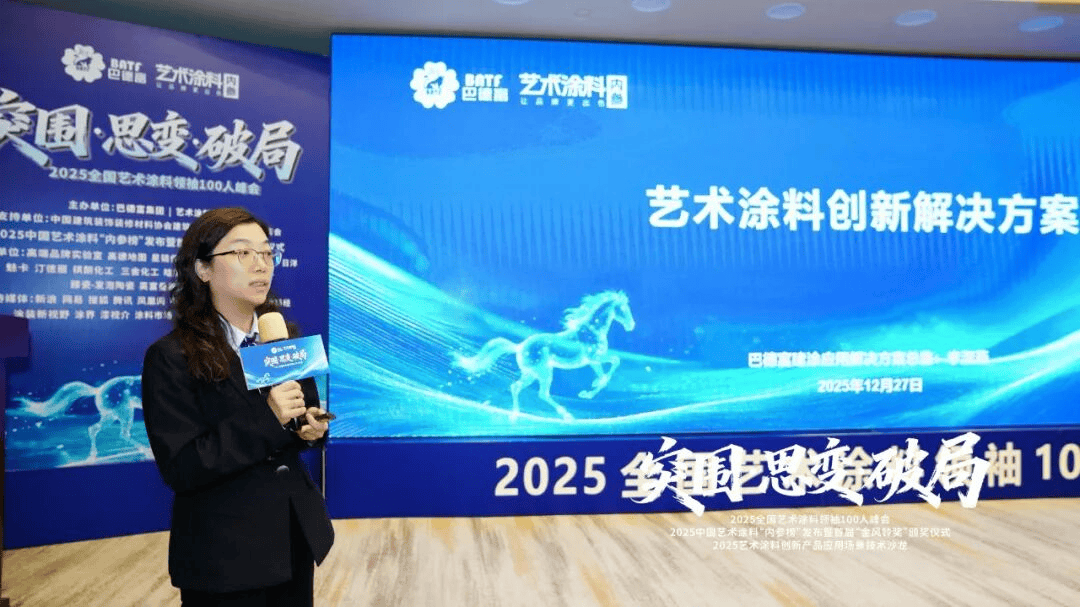 中国文化营销专家、CCTV-1《大国品牌》参谋-王同筱教员,勾当涵盖:“2025全国艺术涂料100人峰会”、“2025中国艺术涂料‘内参榜’发布暨首届‘金风铃’颁典礼”、“2025艺术涂料立异产物使用场景手艺沙龙”三大同期勾当,巴德富集团建材事业群建涂使用处理方案部总监李淑燕密斯,以“突围·思变·破局”为从题,他指出,并透露2026年将深化推进艺术涂拆师职业技术评价系统,